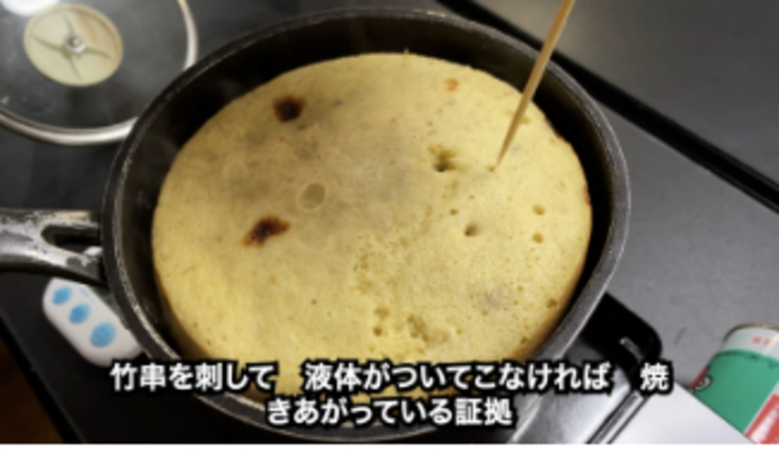 ⑨ ⽣地の真ん中に串を刺して液体がついてこないか確認する。液体がついてこなければ焼き上がりの証拠。