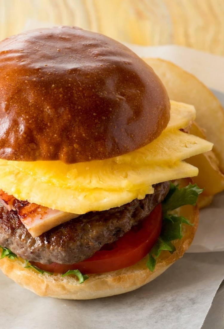 4. バンズにフリルレタス、トマト、パテ、ベーコン、パイナップルの順に挟んでサンドする。