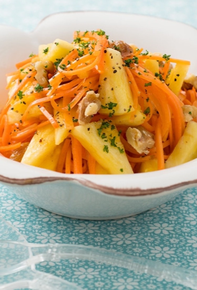 3. 2のボウルに1のパイナップル、レーズン、こしょう、クミンパウダー、オリーブオイル、ワインビネガーを入れて混ぜ合わせ、冷蔵庫で一晩おいて味をなじませる。
